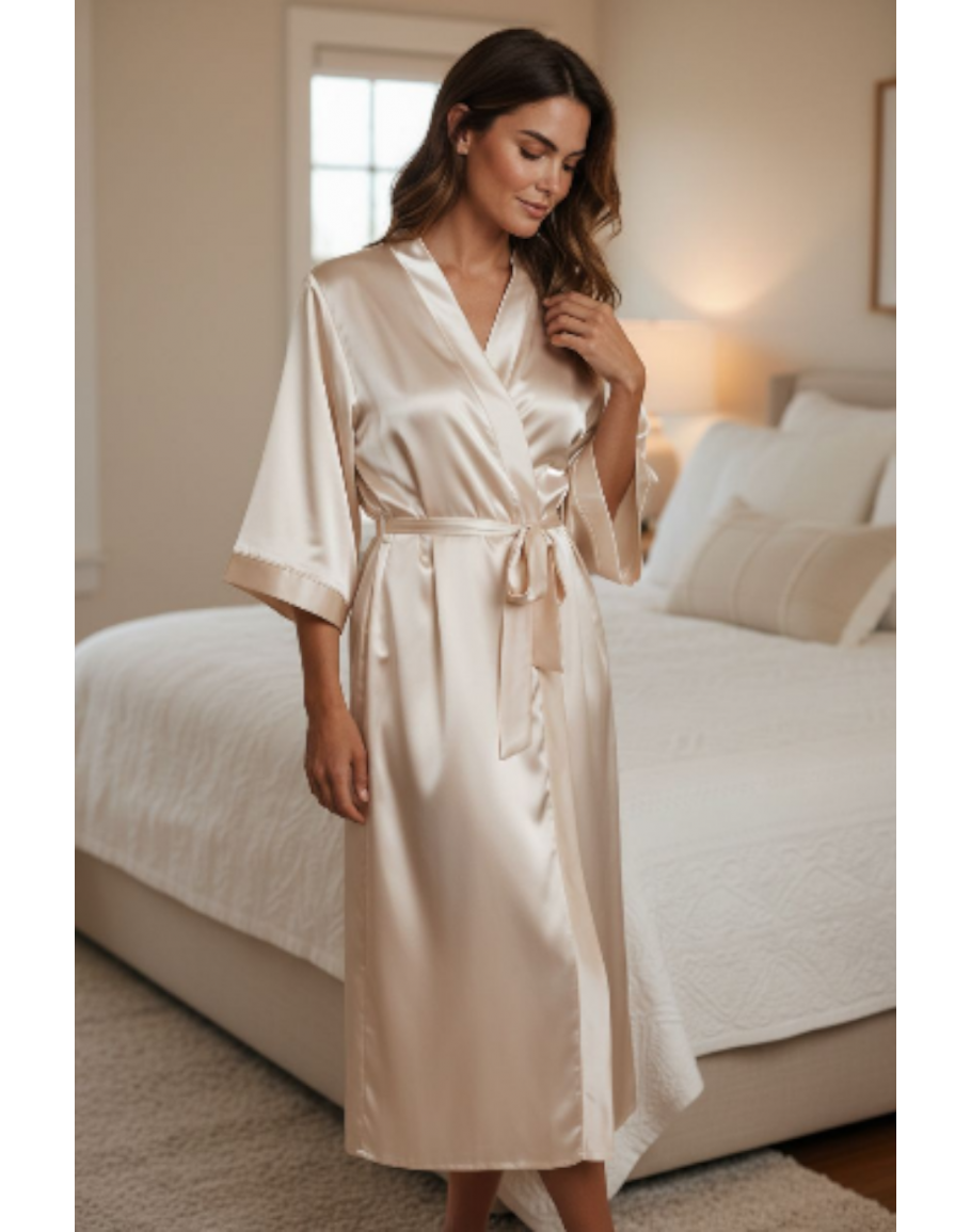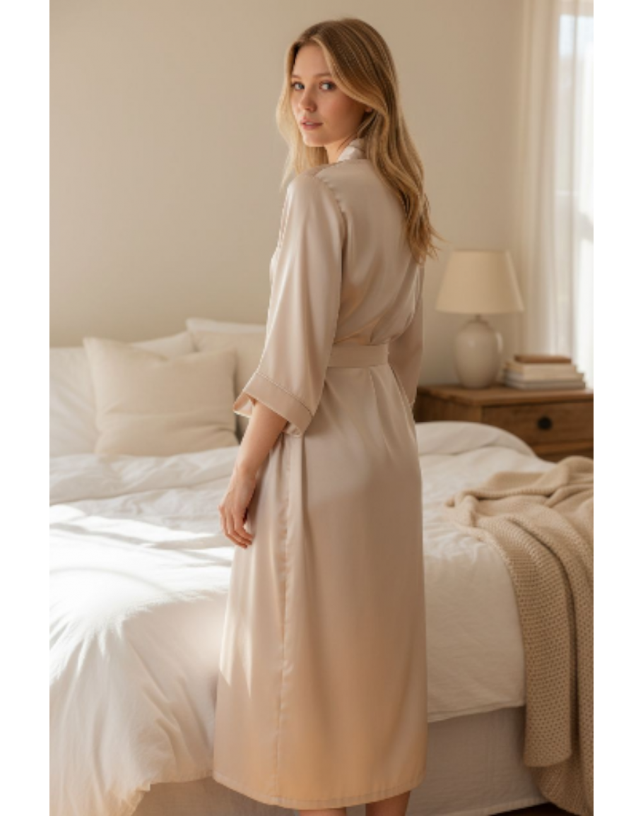 Garš sieviešu halāts no augstas kvalitātes satīna — viegls, zīdains, ar jostu. 1214Sp M-4XL